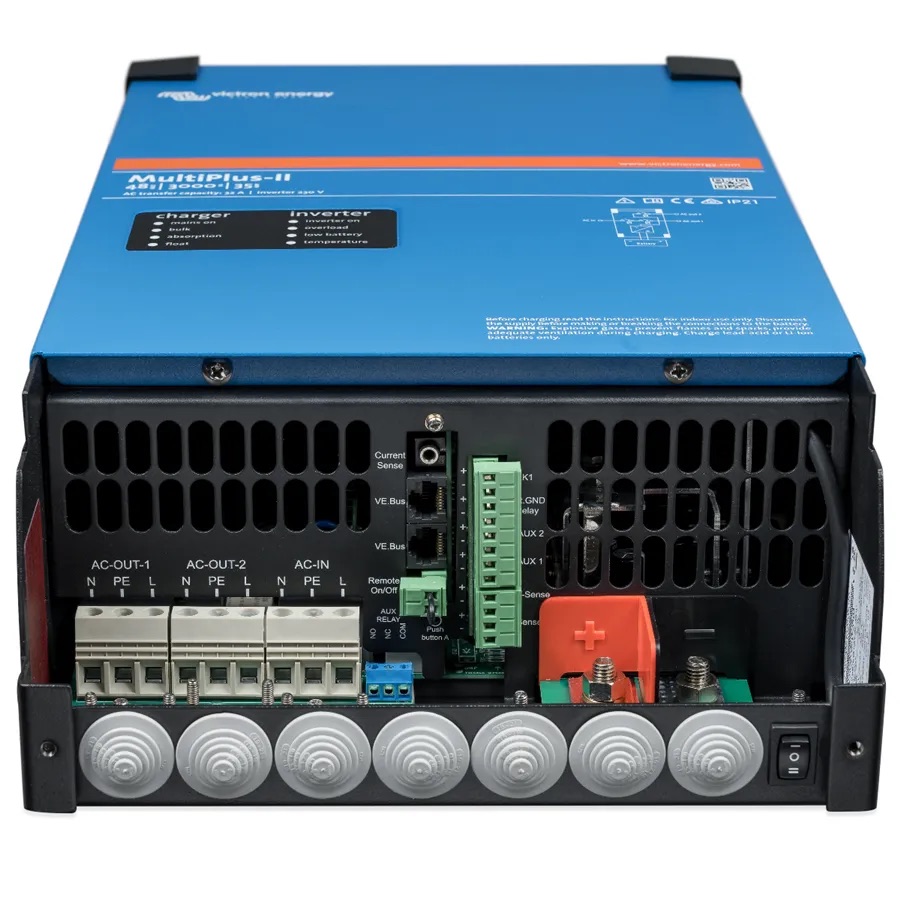 Multiplus-II je výkonný DC-AC hybridní měnič/nabíječ s čistě sinusovým výstupem, s integrovanou adaptivní nabíječkou baterií a ultra rychlým transferovým přepínačem zdroje napájení (baterie/ externí AC zdroj)